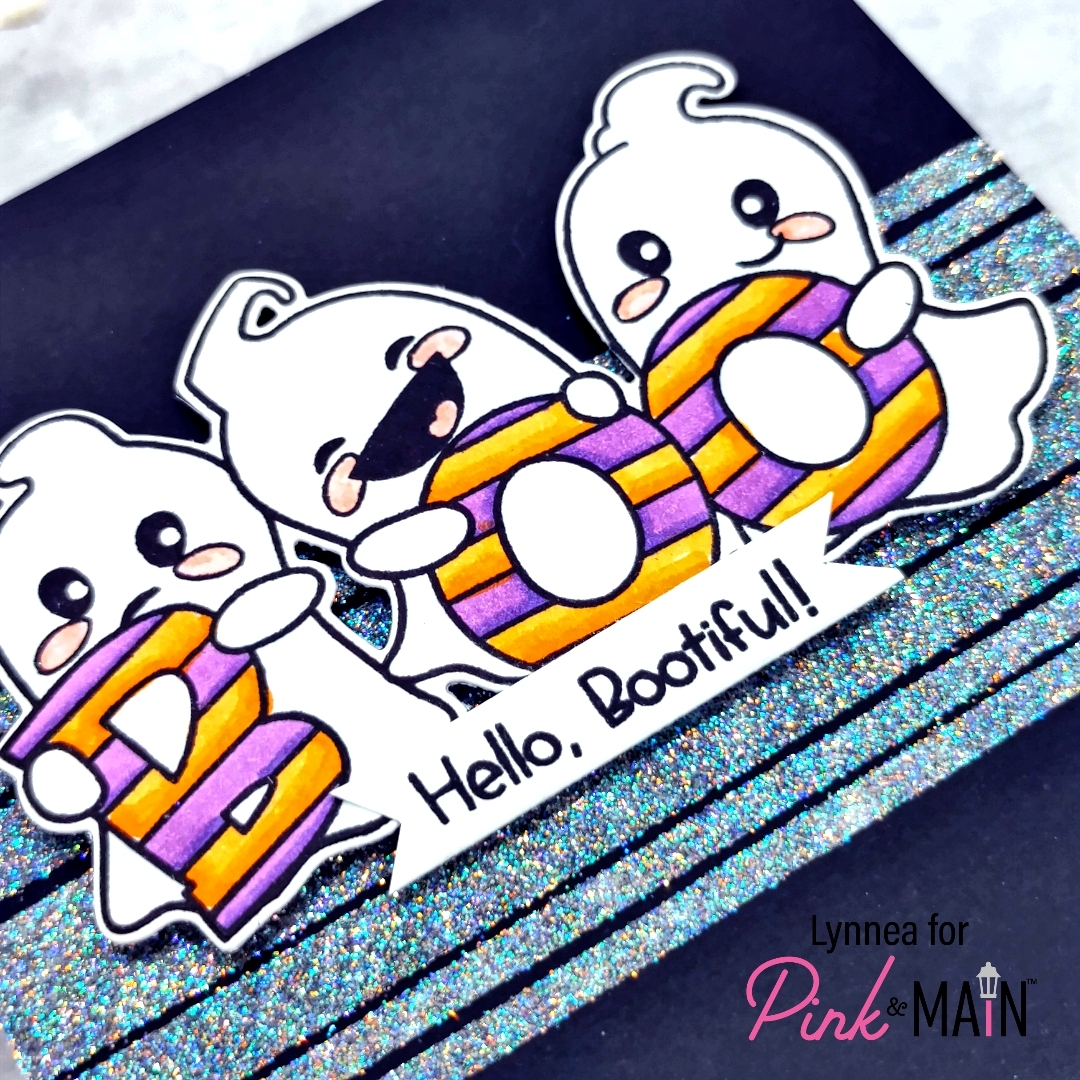 Just look at the shimmer! The photos just don't do it justice! It's stunning in real life! And I love that it was easy to work with! I stamped the cute ghosts from the Hello Bootiful Stamp Set and colored them with Copic Markers and used the coordinating Hello Bootiful Die Set to cut out the image.